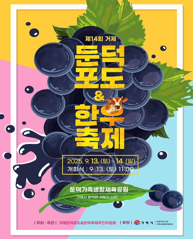·행사일시 : 2025.9.13.(토) - 9.14.(일) ·행사장소 : 둔덕가족생활체육공원 (둔덕면 하둔리 645) ·행사내용 기념식 : 25.9.13.(토) 11:00 / 식전공연 : 10:00 1.포도타기체험, 스템프투어 등 체험프로그램 2.농수산물/먹거리 상시운영 ·주최 : 거제둔덕포도&한우축제추진위원회 |